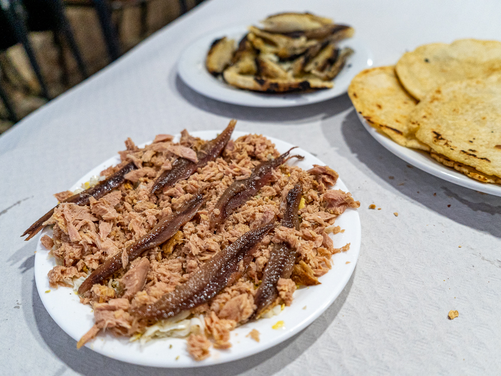 Su mullaor de atún con huevo a diferencia de otros lugares no lleva tomate frito. Y la masa de las coques actualmente ya no la elaboran con maíz, si no únicamente con trigo.