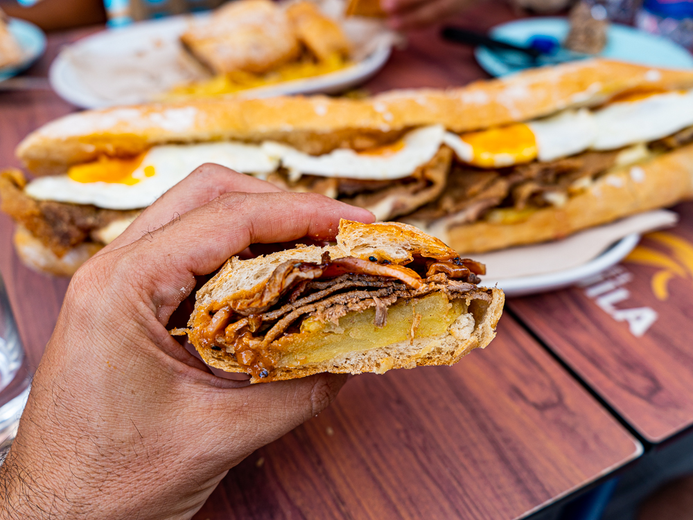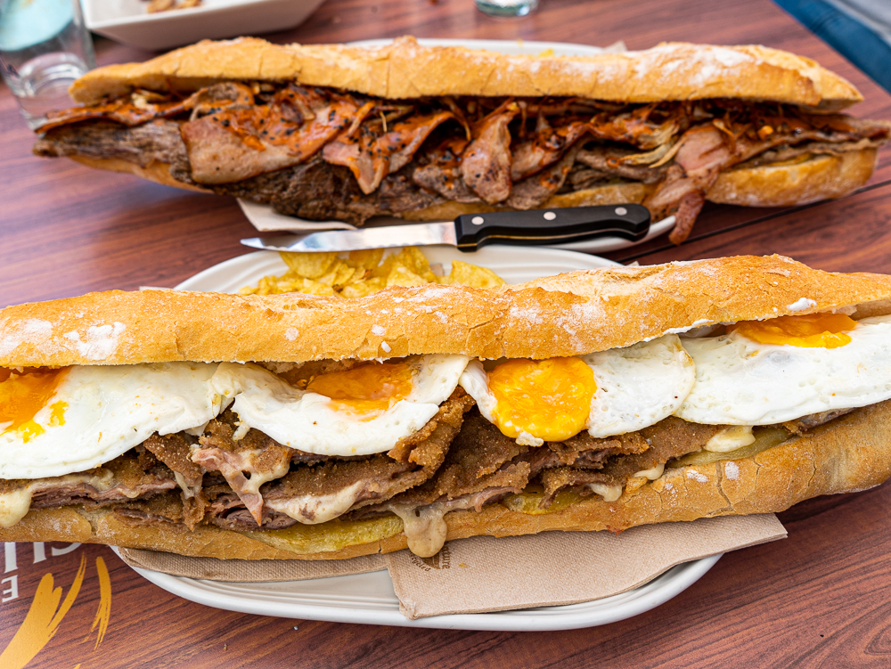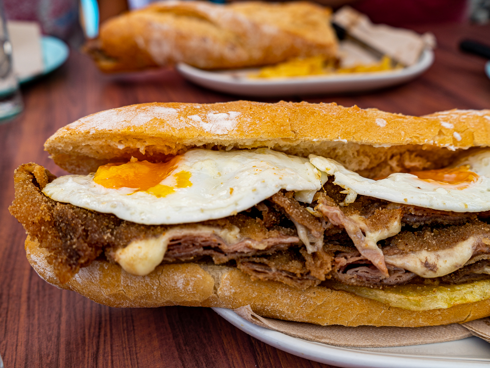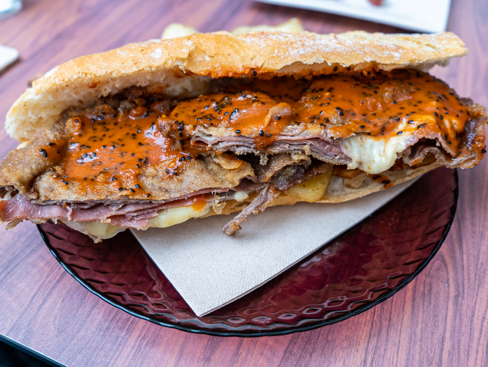 En cuanto a los bocatas, diría que el de Cachopo es uno de sus imprescindibles, básicamente porque no lo vas a encontrar en ningún otro lado y porque está brutal. El cachopo es de carne de caballo muy finita, jamón serrano y queso fundido que regalima en cada mordisco, le acompañan unas patatas fritas. Si eres de los que lo dan todo cuando almuerzas: lo puedes coronar con uno o varios huevos fritos.