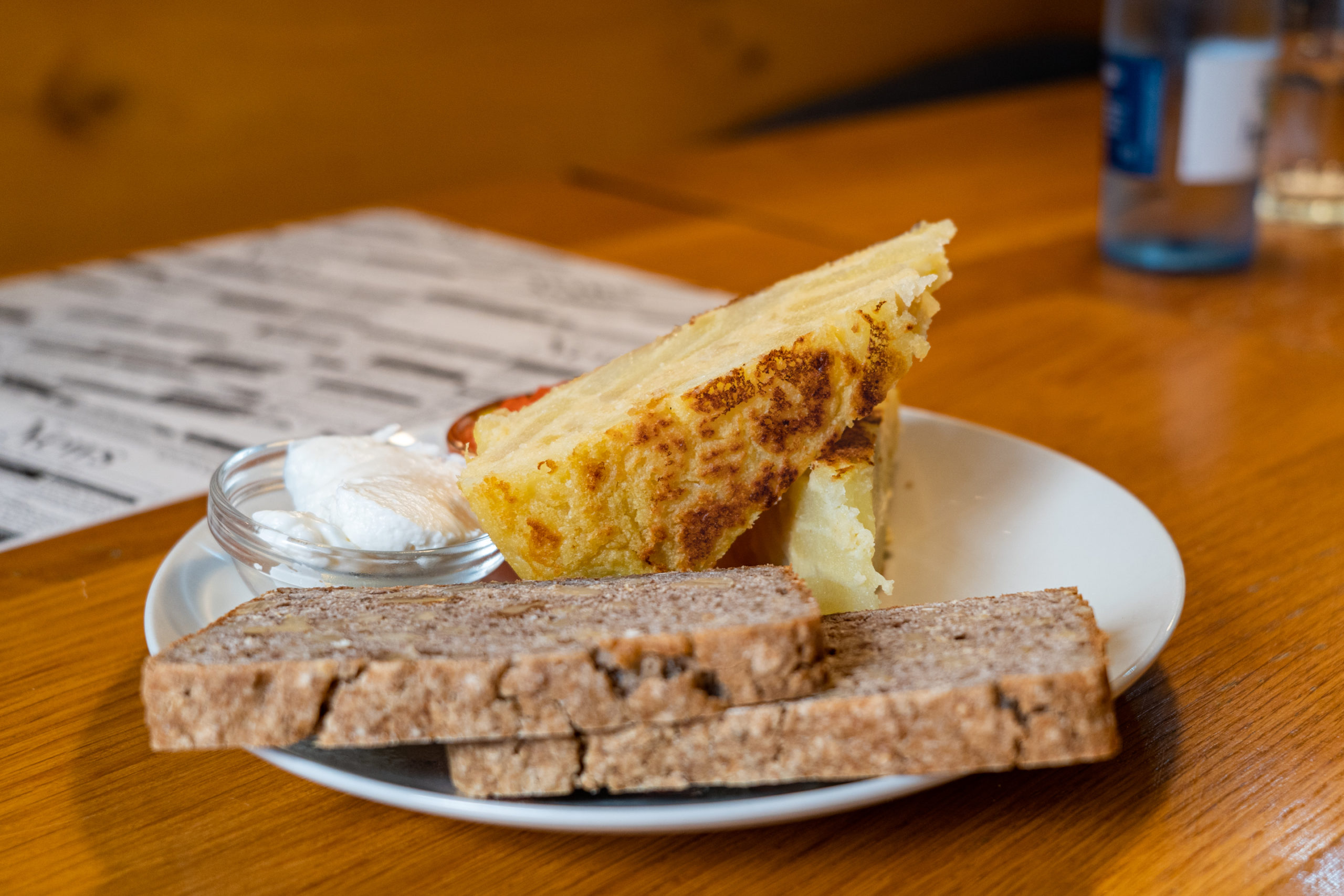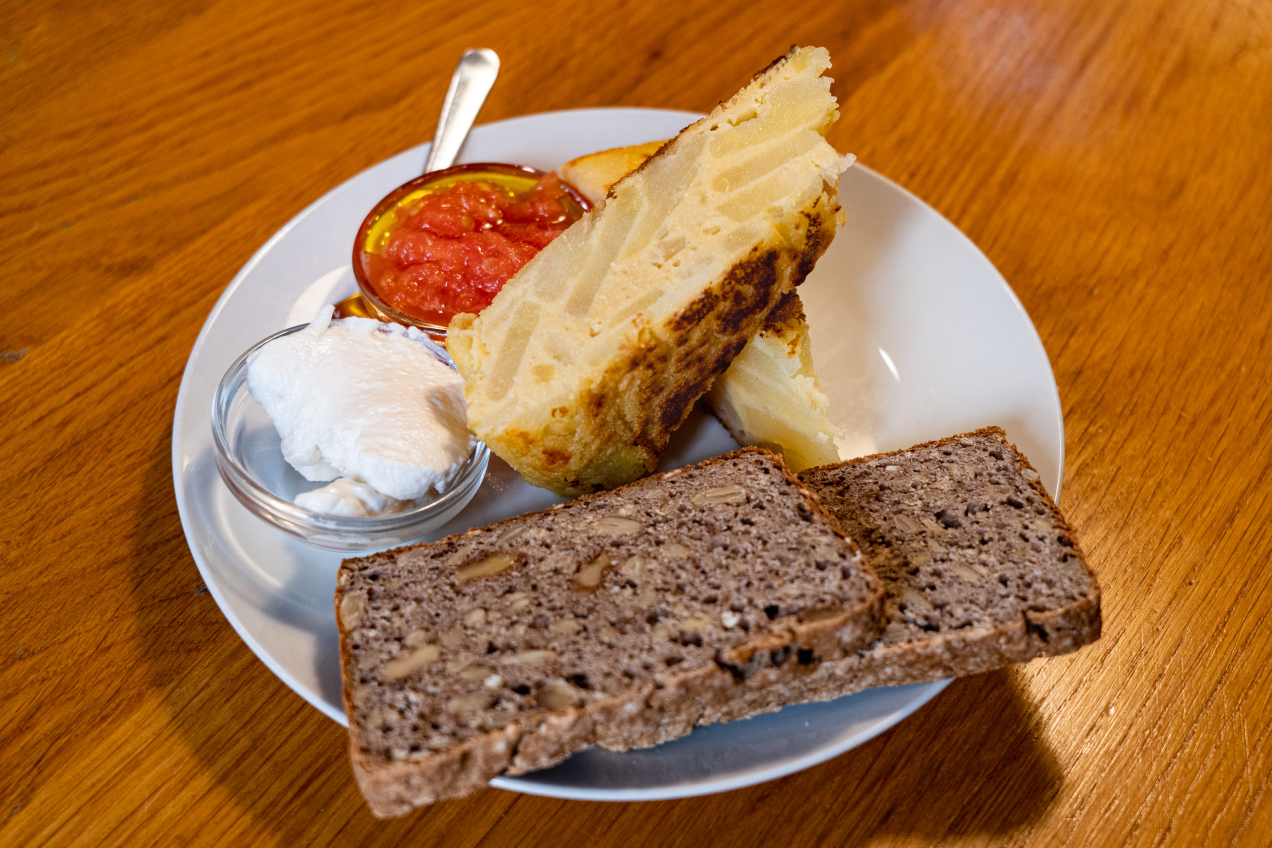 Me decanté por probar la tortilla de patatas, estaba hecha con masa de garbanzos y patatas al vapor. Era una tortilla consistente y completamente cuajada, estaba buena y nunca hubiera dicho que era de garbanzos, me hubiera gustado probarla también con las patatas fritas en vez de al vapor (un 10 por el hecho de que son más saludables). La tortilla iba acompañada de un pan integral sin gluten y con nueces, junto a tomate rayado y ajonesa sin huevo.