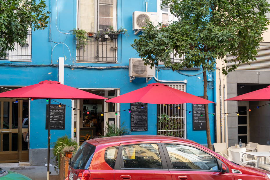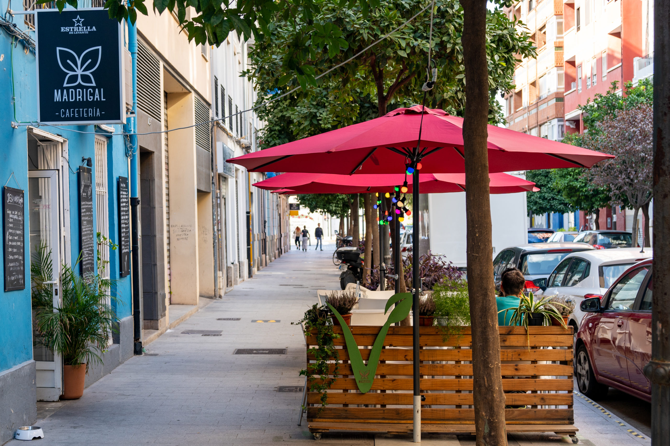La Cafetería Madrigal está ubicada en el barrio de Ruzafa por la zona que da al Parc Central. Es un espacio pequeño, donde puedes ver la cocina y con una terraza con sombrillas en la acera de la calle Puerto Rico.