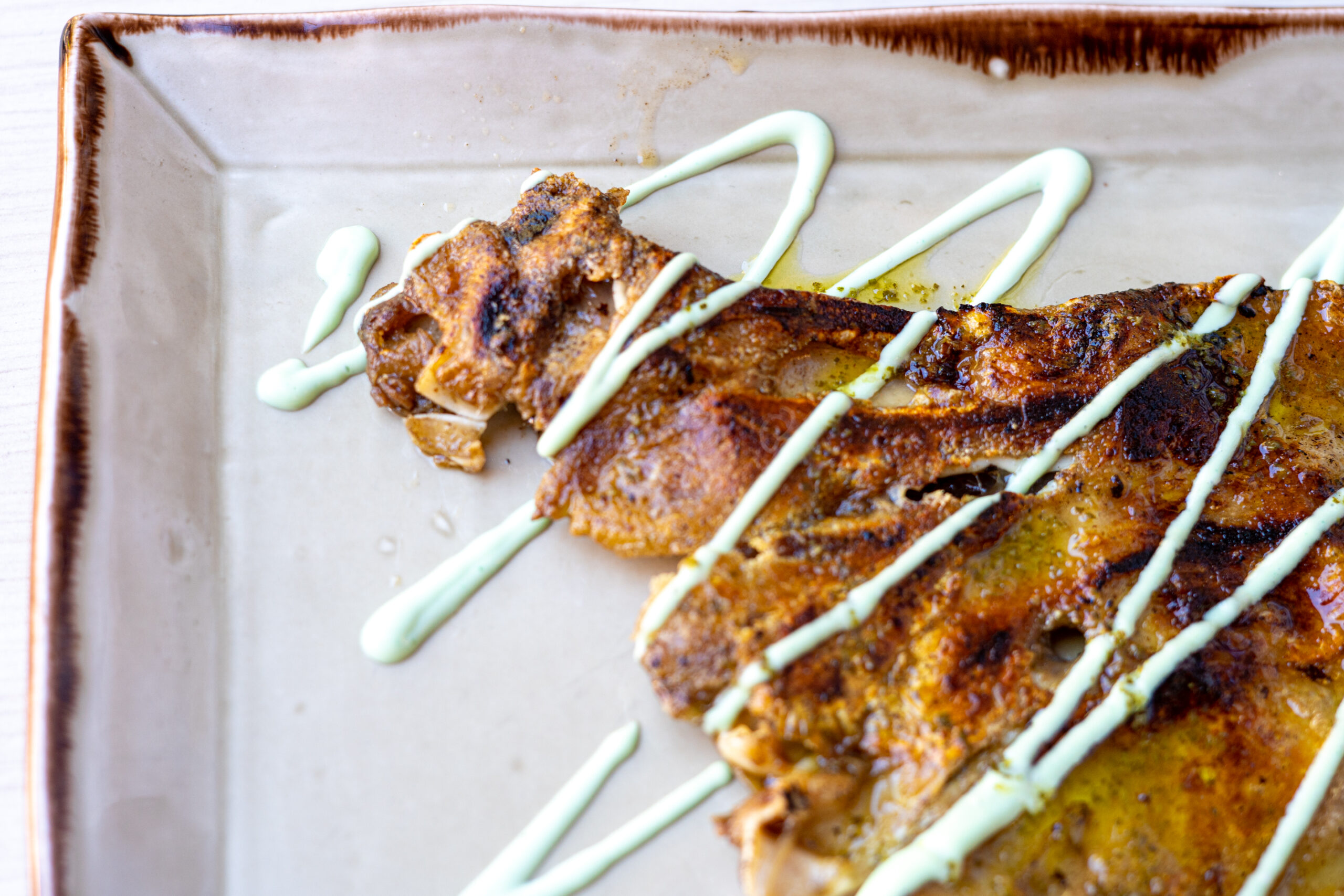 Servida entera permite al comensal cortarla con unas tijeras. Piezas reales de carne, cocinadas y adobadas por varias horas se rematan a la plancha y con una mayonesa de Wasabi. Un espectáculo.